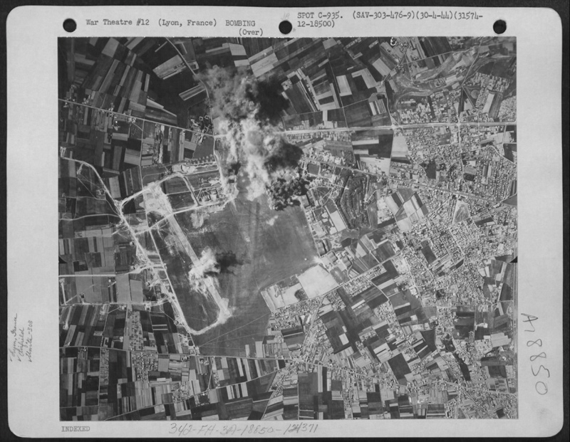 Depuis leur citadelle volante, Watson et Packard observent les fleurs de feu qui jaillissent du sol. Leurs nuages de cendres et de flammes commencent dans les champs de Saint-Priest, là où se dressent aujourd'hui les magasins de la Porte des Alpes. Puis ils traversent la route nationale 6 et se poursuivent en vagues sur l'aéroport, touchant de plein fouet les hangars, les avions, la piste, les hommes. Les bombardiers ont atteint leur cible sans coup férir. En bas, c'est l'enfer. Larguées depuis 6000 mètres d'altitude par les 114 avions B17 de la mission, 555 bombes de 500 kilos pulvérisent l'essentiel des installations militaires et une partie de l'aérogare civile. Les dégâts s'étendent aussi hors de la base, avec 45 maisons totalement ou partiellement détruites, et 47 autres plus légèrement atteintes. L'école de l'avenue Ferdinand-Buisson et l'église Saint-Denis sont également touchées. Le bombardement fait évidemment des victimes. Leur nombre sur la base n'est pas connu ; elle abritait beaucoup de soldats allemands. Dans la ville, deux civils décèdent. La scène n'a duré que 14 minutes. Puis les avions repartent vers l'horizon.