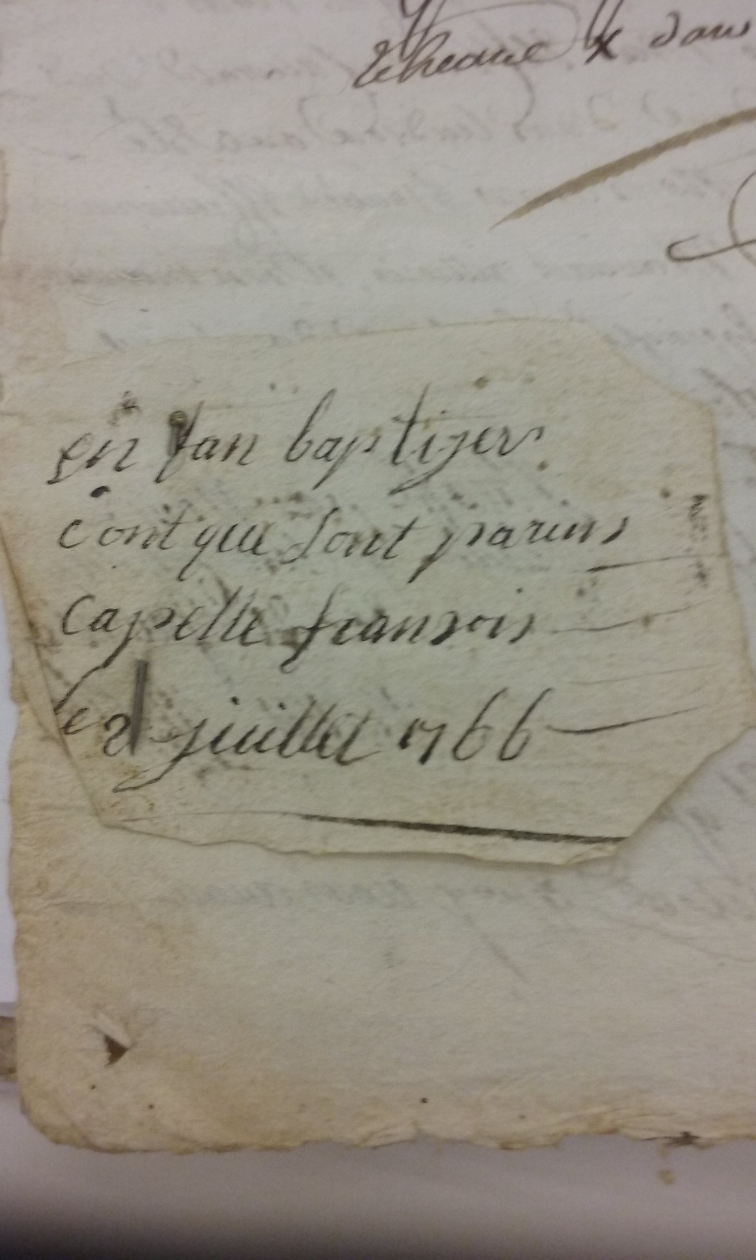 L'écriture est hésitante, bien peu respectueuse de l'orthographe : "enfan baptiser dont que sont parins capelle françois le 2 juillet 1766". En bon français : "cet enfant a été baptisé le 2 juillet 1766 et son parrain s'appelle François". Sur le côté droit du papier, on remarque deux trous ; les traces de l'aiguille qui maintenait ce petit bout de papier accroché au bonnet d'un bébé. Un bébé abandonné par ses parents...