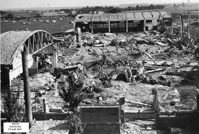 Malgré les dégâts importants qu’il a subis, l’aérodrome joue un rôle de premier ordre au moment de la Libération. Dès le 2 septembre 1944, soit le jour même de l’arrivée des troupes alliées à Lyon, les Ponts-et-Chaussées aidés par l’armée américaine commencent des travaux considérables : « la piste en dur est portée à 1800 m de longueur ; 1.500.000 m2 de terrain sont nivelés ; 25.000 m2 de pistes de circulation et 20.000 m2 d’aires de stationnement construites ; un balisage complet de nuit et de brume réalisé ». Ces aménagements permettent l’envol des escadrilles françaises, anglaises et américaines vers l’Alsace et vers l’Allemagne, engageant ainsi les ailes de Bron dans la victoire contre la barbarie.