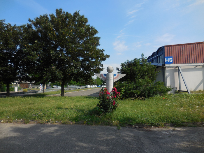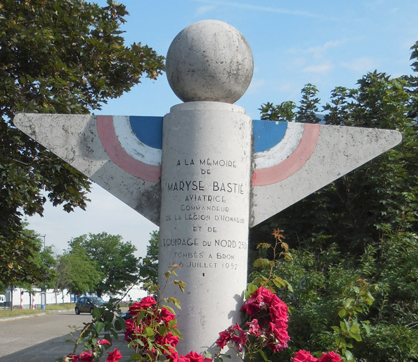 - S'arrêter à l'angle du hangar H5, en face des locaux de Météo France, où l'on trouvera le monument à la mémoire de Maryse Bastié en bordure d'un parking.