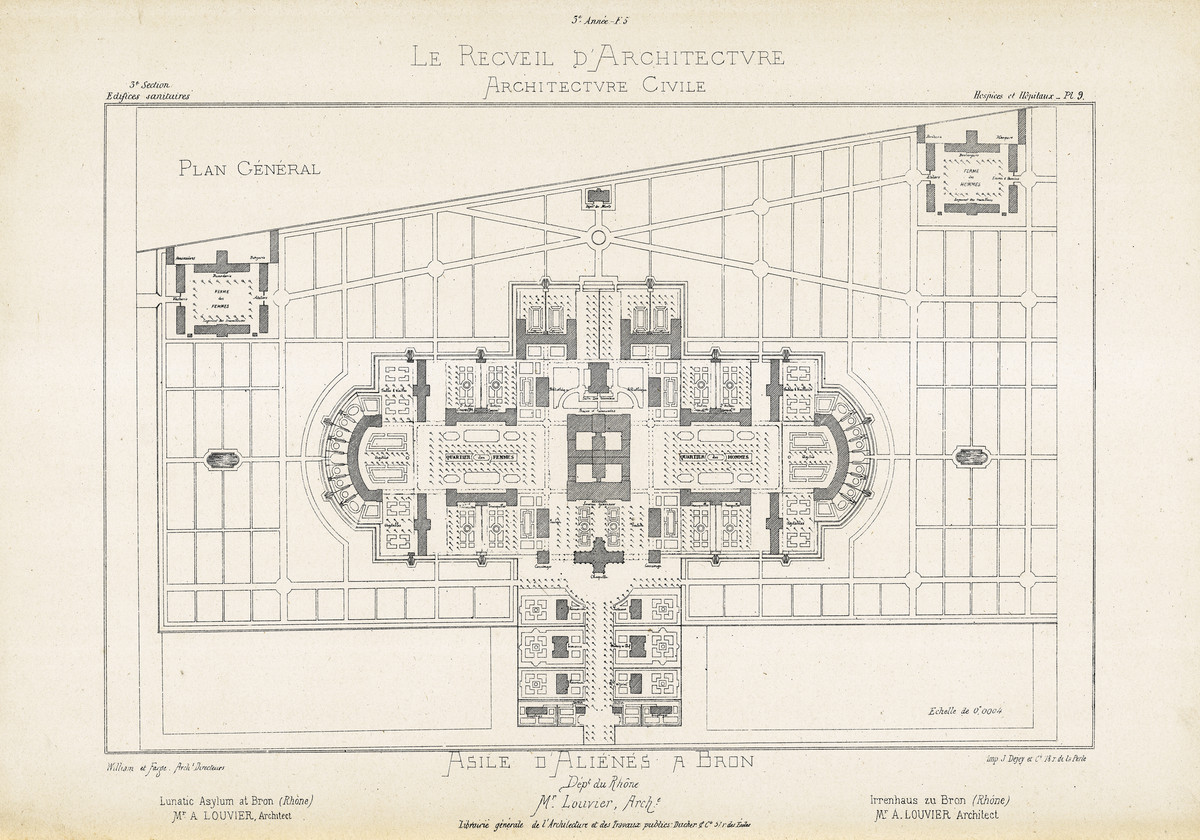En 1838, l'Etat prend le relais du docteur Pinel et de ses collègues humanistes, en obligeant chaque département à se doter d'un hôpital public spécialement destiné à recevoir les aliénés. Le Conseil général du Rhône s'exécute trente ans plus tard, en achetant un château de Bron, le Mas des Tours, et son grand domaine où l'on cultive encore la vigne - d'où le nom du Vinatier. Les travaux de construction de l'hôpital débutent en 1869, sous la direction de l'architecte Antoine Louvier, et l'établissement ouvre ses portes en 1876. "L'asile de Bron", comme on l'appelle à l'époque, se présente comme un village, avec une magnifique chapelle en son centre, et tout un ensemble de pavillons semés sur une centaine d'hectares : au sud de la chapelle le quartier des hommes, au nord le quartier des femmes, chaque quartier comprenant des bâtiments voués aux différentes catégories de malades - les "tranquilles", les "agités", les épileptiques, etc. Au-delà s'étendent les installations permettant à l'asile de vivre en quasi autarcie, comme un moulin, une boulangerie, une ferme avec ses troupeaux, des ateliers, un château d'eau, les villas du personnel, et même un cimetière, sans oublier les terres agricoles qui, aujourd'hui muées en parc, font du Vinatier l'un des plus grands espaces verts de l'agglomération. En fonction de leur état, les malades peuvent travailler dans les ateliers ou à la ferme, ou bien restent cantonnés dans leurs pavillons respectifs.